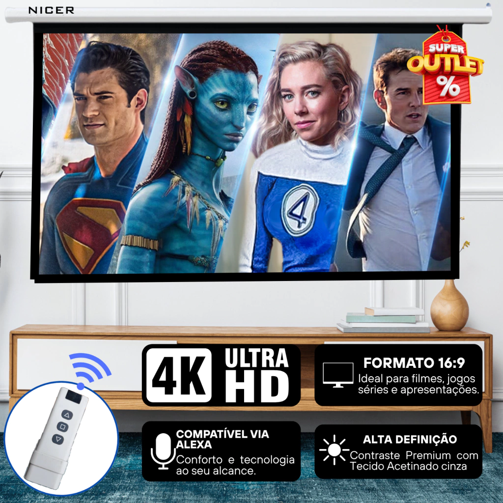 - Tela Elétrica com controle remoto infravermelho, receptor de sinal com botões de comando.